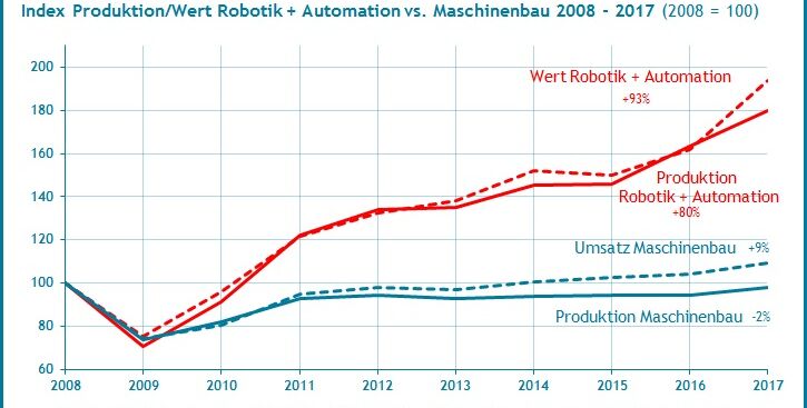 Bereits 2010 hatten Produktion und Umsatz der Branche Robotik und Automation das Vorkrisenniveau überschritten – dem Umsatz des Maschinenbaus gelang dies erst 2014 und der Produktion im Jahresvergleich bis 2017 nicht. Die Produktion der Branche stieg im Vergleich zum Vorkrisenjahr 2008 um 80 Prozent, der Wert bzw. Umsatz der Branche sogar um 93 Prozent. Der Maschinenbau konnte demgegenüber seinen Umsatz zu 2008 um 9 Prozent steigern, die Produktion liegt 2017 noch um 2 Prozent hinter dem Vorkrisenniveau, wie die Marktuntersuchung zeigt.