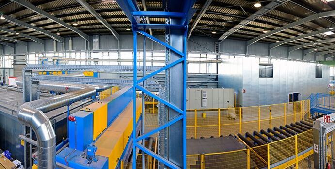 Der Farbauftrag erfolgt pro Farbton jeweils mit acht Spritzpistolen, die von oben und unten lackieren. Um Overspray zu reduzieren, wird der Einsatz der einzelnen Pistolen durch eine Werkstückerkennung und Wegemessung gesteuert. Auf eine optimale Aushärtung der wasserbasierten Lacke wurde der rund 35 Meter lange Trockner ausgelegt. Er ist mit mehreren Gasbrennern sowie oben und unten angeordneten Ventilatoren ausgestattet. Dadurch lassen sich Bereiche mit unterschiedlicher Wärmeintensität schaffen. Dies gewährleistet, dass der Lack zu Beginn der Trocknung keine Haut bildet, die ein Ausdunsten der Feuchtigkeit verhindert. Danach erfolgt die automatisierte Kennzeichnung der Bleche zur Sicherstellung der Nachverfolgbarkeit. Die Bleche und Profile werden an den vorgewählten (zwei unterschiedlichen) Entladepositionen für die weitere Verwendung bereitgestellt.
