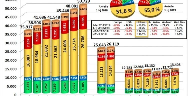 China konnte seinen Anteil an der Weltproduktion nochmals steigern und erreichte 55 Prozent. Die chinesischen Hersteller haben im Halbjahresvergleich ihren Ausstoß nochmals um 8,5 Prozent erhöht, während er in Europa um 4,9 Prozent gesunken ist. Interessant sind die Wachstumsvergleichszahlen 2018 zu 2012, die einen klaren Trend der Verlagerung der Produktion aus Europa erkennen lassen.