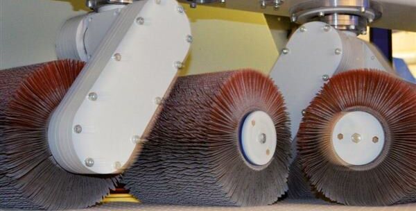 Für das Verrunden der Kanten setzt man seit vielen Jahren auf die Planetenkopftechnik mit eng nebeneinander angeordneten Bürstenköpfen. Damit wird die Gleichmäßigkeit der Verrundung über die gesamte Arbeitsbreite sichergestellt. Entzundert wird mit dem MRB Bürstsystem, das mit mehrfach rotierenden Walzenbürsten arbeitet. Auch hier sind mehrere Köpfe nebeneinander angeordnet, um alle Kanten gleichmäßig zu bearbeiten. Durch die kompakte Bauweise können problemlos mehrere Bearbeitungsverfahren miteinander in einer Maschine kombiniert werden.