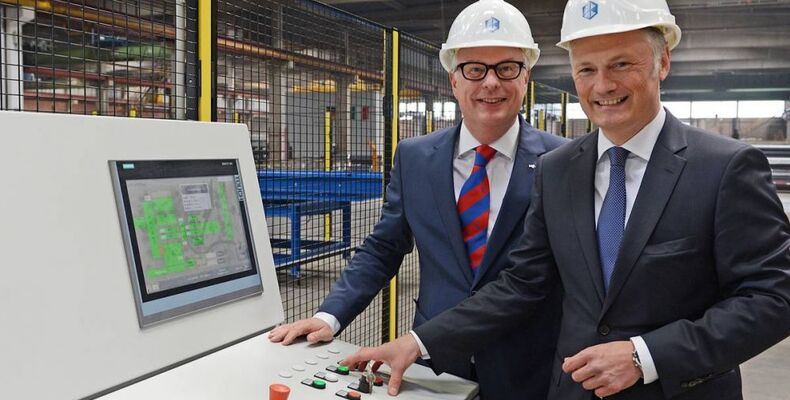 Thomas Maschmann, Leiter strategischer Einkauf, Schmitz Cargobull AG (links) und Martin Gruber, CEO der SCHMOLZ + BICKENBACH Distributions GmbH (rechts) bei der Inbetriebnahme der neuen Fertigungsanlage in Düsseldorf.