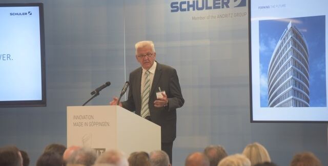 Quelle: Schuler Bildtext: "Die neue Konzernzentrale bietet Freiheit zum Denken", sagte Ministerpräsident Kretschmann bei der Eröffnung. (Foto: Schuler)