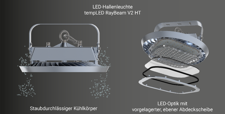Die LED-Hallenleuchte RayBeam V2 HT bietet gleich zwei Lösungen für das Problem: Das Leuchtengehäuse, inklusive Kühlkörper, ist so konzipiert, dass es den Staub einfach durchfallen lässt, statt dass dieser sich festsetzen kann. Zusätzlich bietet die LED-Leuchte eine serienmäßig, vor die Optik der RayBeam V2 HT verbaute Abdeckscheibe. Diese besteht aus einem 5mm starken ESG-Sicherheitsglas und überzeugt in erster Linie mit ihrer absolut glatten Oberfläche. Anders als bei handelsüblichen Optiken haben hier auch kleinste Staubpartikel wenig Chance, sich festzusetzen. Diese beiden Designmerkmale reduzieren die Schmutzanhaftungen auf ein Minimum und erleichtern zusätzlich auch noch die Reinigung, was beides in einer langen Lebensdauer und maximalen Leuchtkraft resultiert.
