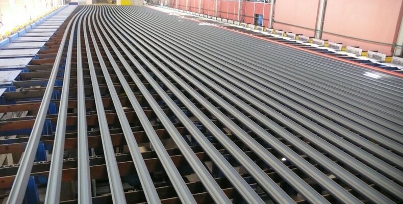 Quelle: SMS group Bildtext: Kühlbett mit Vorbiegeeinrichtung für Schienen (Foto: SMS group)