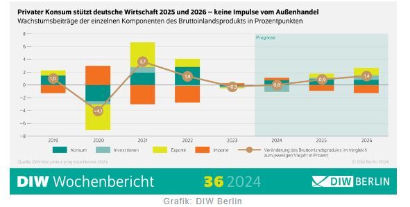 Der private Konsum dürfte sich im weiteren Prognosezeitraum als entscheidende Wachstumsstütze erweisen, auch wenn Zukunftssorgen angesichts leicht steigender Arbeitslosenzahlen und Verunsicherung über wirtschaftspolitische Rahmenbedingungen die Kauflaune der Verbraucher*innen zuletzt etwas trübten. „Auch die Fußball-Europameisterschaft konnte den privaten Verbrauch nicht anschieben“, sagt DIW-Konjunkturchefin Geraldine Dany-Knedlik. Statt es auszugeben, legen die Verbraucher*innen mehr von ihrem Einkommen auf die hohe Kante. Die Sparquote liegt aktuell bei 10,8 Prozent.