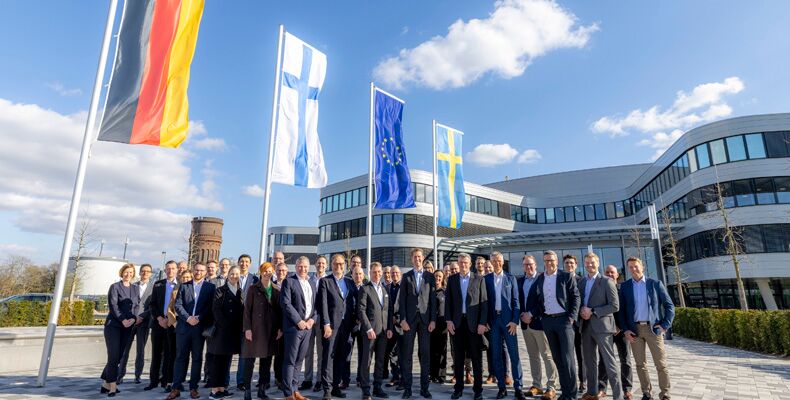 Foto: Teams von SSAB und SMS group bei der Unterzeichnung des Early Services Agreements auf dem SMS Campus in Mönchengladbach