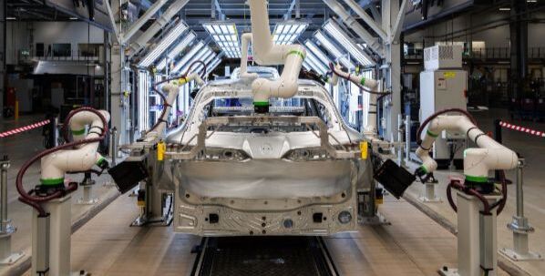 Bildtext: Rohkarosse eines BMW iX3 – bluemint® recycled wird für ausgewählte Außenhautteile verwendet.