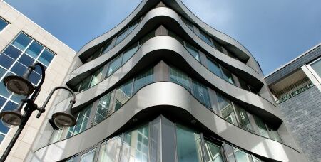 „Wir haben ein Material gesucht, mit dem wir diese Wellen realisieren können – und das zudem eine Oberfläche hat, die etwas Besonderes ist“, erinnert sich Anna Vering, die leitende Architektin des Architekturbüros. Mit PLADUR Relief iceCrystal von ThyssenKrupp Steel Europe haben die Architekten ein solches Material gefunden: Hochwertiger Qualitätsflachstahl, dessen Oberfläche wie von Eisblumen überzogen scheint – und das daher den Namen iceCrystal trägt. Bislang wurde der Baustoff vor allem im Industriebau als hinterlüftete Fassade eingesetzt, die Verwendung im hochwertigen Geschossbau ist eine Premiere.