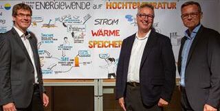 Bildtext: Hanno Balzer, Vattenfall Energy Solutions, Alexander Voigt, Lumenion, und Karsten Mitzinger, Gewobag ED (v.l.), beim heutigen Projektstart zum neuartigen, sektorenkoppelnden Energiespeicher.
