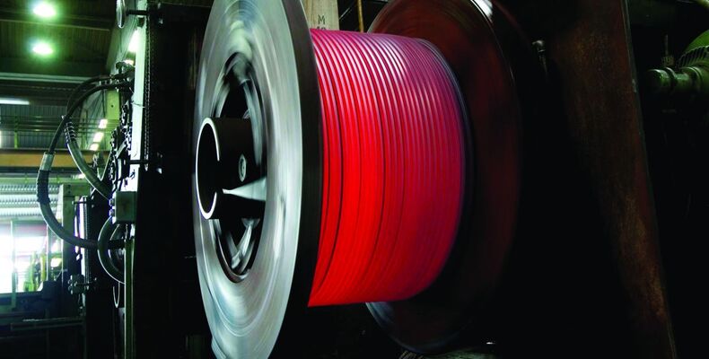 Quelle: Steeltec Bildtext: Stahldraht-Coil nach der Bearbeitung im Warmwalzwerk. Die eingesetzten Drahtringe werden aneinandergeschweißt und das zu fertigende Profil wird in einer Grundeinstellung gefertigt. (Foto: Steeltec)