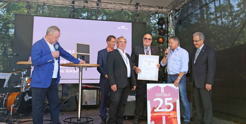 Quelle: STILL GmbH Bildtext: Zum 25-jährigen Betriebsbestehen übergibt Peter Dreißig (3.v.r.), Präsident der Handelskammer Cottbus, eine Urkunde an Hans-Joachim Waury (4.v.r.), Geschäftsführender Gesellschafter der Waury Fördertechnik GmbH (Foto: STILL GmbH)