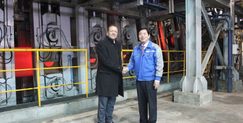 Quelle: SMS group Bildtext: Yongdo Huh, Vorsitzender/Gründer von TAEWOONG, und Luis Hernandez, CEO der SMS Concast, mit einem 1.000-Millimeter-Rund-Vorblock, gegossen auf der Stranggießanlage bei Taewoong (Foto: SMS group)