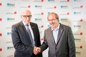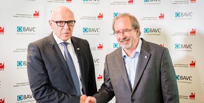 Quelle: IG BCE, marketSTEEL; Bild: Die Verhandlungsführer Georg Müller vom BAVC (links) und Peter Hausmann von der IG BCE besiegeln den Abschluss. (Foto: Stefan Koch)