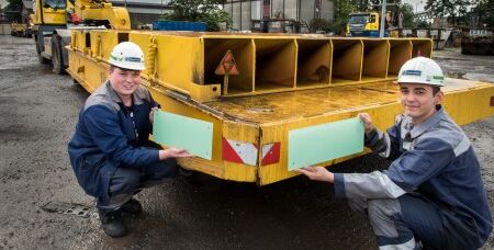 Fatin Tonk und Maximilian Zenker machten sich an die Bewältigung eines Problems an ihrem Arbeitsplatz: die Beleuchtung von Transportfahrzeugen für heiße Stahlblöcke. „Die Brammentransporter auf dem Werkgelände können manchmal bei Dunkelheit und Nebel schlecht gesehen werden“, erläutert Tonk. Die Schwierigkeit bestand darin, dass die Stahlblöcke bei der Beförderung noch 300 bis 600 Grad heiß sind. „Da wegen der hohen Temperaturen des Transportguts eine elektrische Beleuchtung technisch nicht möglich war, haben wir uns für eine nachtleuchtende Beschilderung entschieden“, berichtet Zenker. „Sie speichert tagsüber Licht und gibt es nachts wieder ab.“ Erreicht wird dies durch eine spezielle Pigmentschicht, die auch die abstrahlende Hitze aushält.