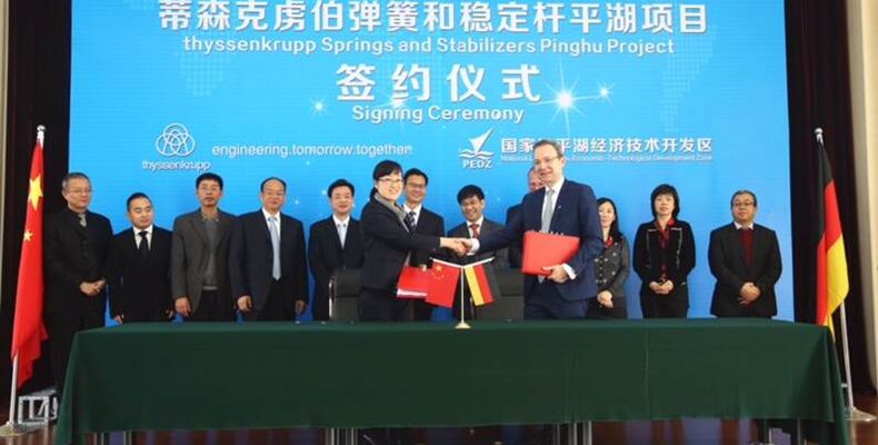 thyssenkrupp errichtet in der chinesischen Stadt Pinghu ein neues Werk für Federn und Stabilisatoren. Ab 2018 sollen dort jährlich insgesamt rund fünf Millionen Federn und Stabilisatoren für internationale Automobilhersteller produziert werden, dafür investiert der Essener Industriekonzern rund 30 Millionen Euro. „Mit dem neuen Standort in Pinghu errichten wir bereits das dritte Werk für Federn und Stabilisatoren in der Volksrepublik China und bauen damit unser globales Produktionsnetzwerk weiter aus. Wir werden an dem neuen Standort modernste Fertigungsverfahren einsetzen und unsere Produkte durch lokale Entwicklungsteams speziell für unsere Kunden auf dem chinesischen Markt weiterentwickeln", so Karsten Kroos, CEO der Komponentensparte von thyssenkrupp.