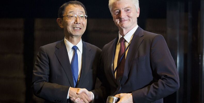 Quelle: worldsteel, thyssenkrupp Steel Europe Bildtext: Dr. Heinrich Hiesinger, CEO von Thyssenkrupp (rechts) erhält die Auszeichnung von Kosei Shindo, Representative Director und President, Nippon Steel Sumitomo Metal Corporation (links). (Foto: worldsteel)