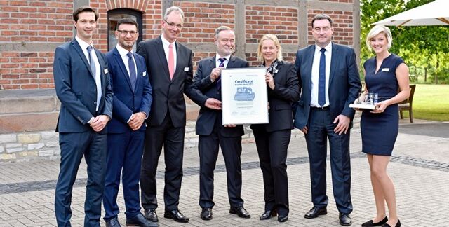 Quelle: thyssenkrupp Steel Artikelfoto: Britta Schirpke (3. v. r.), Christoph Gräfe (M.) sowie Norbert Schönborn (3. v. l.) aus dem Vertrieb der thyssenkrupp Hohenlimburg GmbH nahmen die Auszeichnung in Ahlen entgegen. Den Preis überbrachten Volker Birken, Besim Jakob, Arno Ruschhaupt und Denis Dräger (v. l. n. r.) von der Winkelmann Group. (Foto: thyssenkrupp)