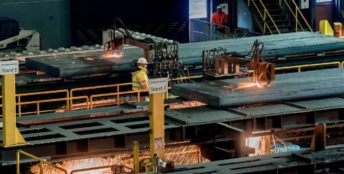 Quelle: thyssenkrupp Steel Europe Artikelfoto: Auf insgesamt sechs sogenannten „Tischen“ können die Brammen exakt nach Kundenwunsch zugeschnitten werden. (Foto: thyssenkrupp)