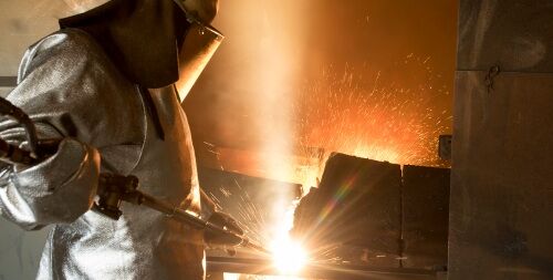 Quelle: thyssenkrupp Steel Europe Bildtext: Auf dem Gelände des thyssenkrupp-Werkes im Duisburger Norden zerkleinern Mitarbeiter u. a. mit großen Schneidbrennern Stahlschrott. (Foto: thyssenkrupp)