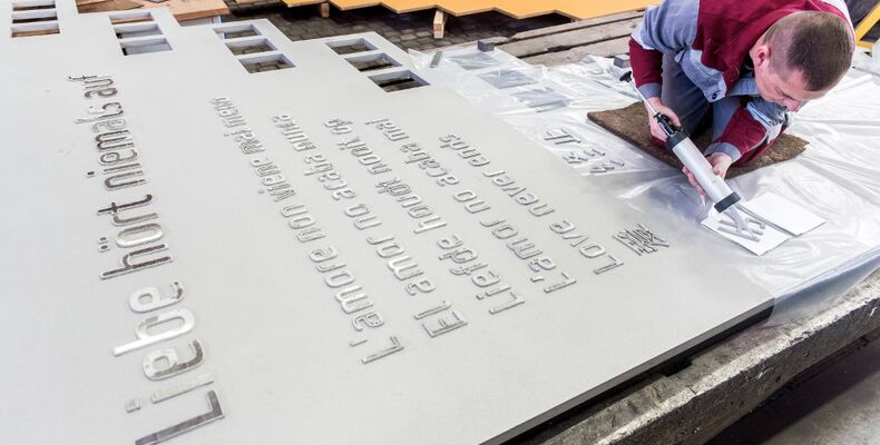 Quelle: ThyssenKruppSteel Europe Bildtext: Die Stahlplatte mit dem Schriftzug „Liebe hört niemals auf“ wird neben der Treppe im Tunnel an der Karl-Lehr-Straße installiert, eine zweite Platte auf dem Boden platziert. (Foto: ThyssenKrupp)