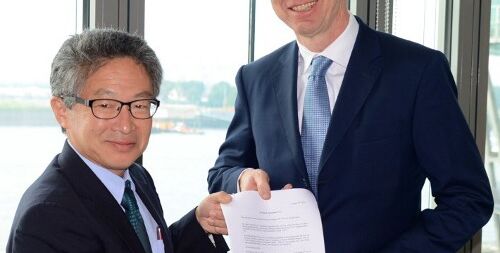 Quelle: thyssenkrupp Steel Europe Bildtext: Vereinbarten den Austausch innovativer Umformverfahren bei hochfesten Stahlsorten im Automobilbereich: Dr. Heribert Fischer (r.), Vertriebsvorstand der thyssenkrupp Steel Europe AG, und Takafumi Nishiuma, Senior Vice President für Sheet Business Planning der JFE Steel Corporation. (Foto: thyssenkrupp)
