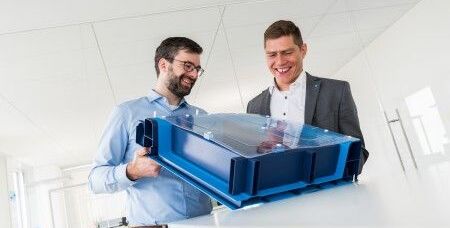 Quelle: thyssenkrupp Steel Europe Bildtext: Daniel Nierhoff, Forschung und Entwicklung und Andreas Untiedt, Kundenprojektingenieur, beide bei thyssenkrupp Steel, haben einen crashsicheren Batteriekasten für E-Autos konzipiert. (Foto: thyssenkrupp)