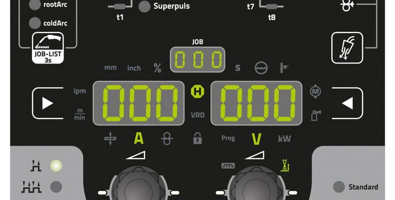 Zur Verfügung stehen serienmäßig forceArc, forceArc puls, wiredArc, wiredArc puls, coldArc, coldArc puls, rootArc, rootArc puls, Positionweld sowie MIG/MAG-Impuls- und -Standardlichtbogen.
