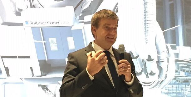 Bildtext: Dr.-Ing. Heinz-Jürgen Prokop, Chief Executive Officer Machine Tools bei TRUMPF, auf der Pressekonferenz des Unternehmens auf der Blechexpo.