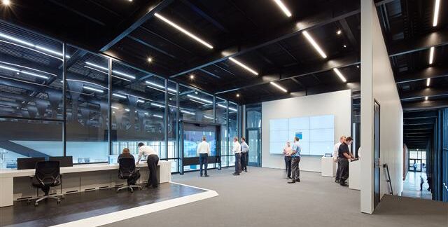 Die Smart Factory von TRUMPF besticht durch ihre maßgeschneiderte Architektur: Der „Control Room” – eine Schaltzentrale mit großen Displayflächen – stellt den Besuchern in Echtzeit Prozesskennzahlen aus der laufenden Produktion zur Verfügung. In einer 55 Meter langen Produktionshalle befindet sich eine verkettete Blechfertigung mit einem Hochregallager als Herzstück, das die daran angebundenen Werkzeugmaschinen mit Material versorgt. Einen Blick aus der Vogelperspektive bietet ein Laufsteg, der die Produktionshalle überspannt. Der so genannte Skywalk ermöglicht es, die Produktionsanlagen mit ihrem Material- und Informationsfluss als Gesamtsystem zu begreifen. Er ist Teil der frei tragenden Deckenstruktur aus Stahl, die von einem TRUMPF Kunden in Atlanta gefertigt wurde. Entworfen wurde die Demofabrik vom Berliner Architekturbüro Barkow Leibinger.