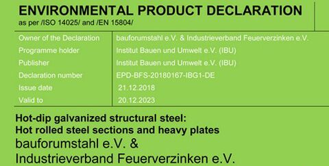 Düsseldorf - Die erstmals in 2013 veröffentlichte Umweltproduktdeklaration für feuerverzinkte Baustähle wurde im Dezember 2018 aktualisiert und ist bis Ende 2023 gültig. Seit Kurzem ist sie auch in englischer Sprache verfügbar.