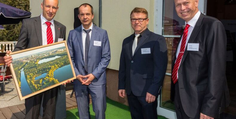 Quelle: Unitechnik Automatisierungs GmbH Bildtext: Gratulation von ArcelorMittal (v.l.n.r.: Karsten Boldt, Geschäftsführer Unitechnik Automatisierungs GmbH, Dr. Ralf-Peter Bösler, Geschäftsführer Primary bei ArcelorMittal Eisenhüttenstadt, Dietmar Löwenberg, Leiter Neubau bei ArcelorMittal Eisenhüttenstadt, Torsten Ley, Geschäftsführer Unitechnik Automatisierungs GmbH) (Foto: Unitech Automatisierungs GmbH)