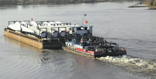 Bildtext: Großvolumige Güter wie etwa Rotorblätter von Windenergieanlagen sollen nach dem Willen von Wirtschafts- und Klimaschutzminister Robert Habeck (Grüne) überwiegend per Binnenschiff transportiert werden, um die Energiewende schnell zu erreichen.