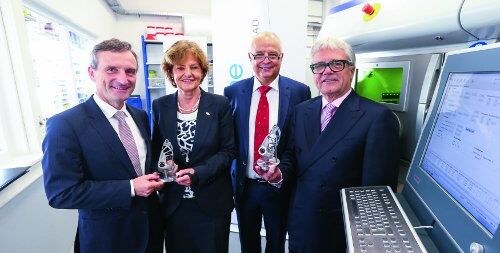 Quelle: voestalpine AG Bildtext: Eröffnung AMC Düsseldorf. v.l.n.r.: Thomas Geisel (Oberbürgermeister der Landeshauptstadt Düsseldorf), Angelika Mielke-Westerlage (Bürgermeisterin der Stadt Meerbusch), Franz Rotter (Chef der Special Steel Division), Wolfgang Eder (voestalpine CEO) (Foto: voestalpine)