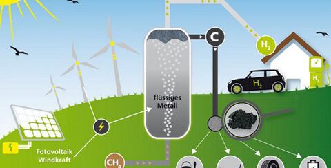 gasförmigen Wasserstoff und festen Kohlenstoff gespalten, der einen wertvollen Grundstoff für verschiedene Industriezweige darstellt und darüber hinaus sicher gelagert werden kann.