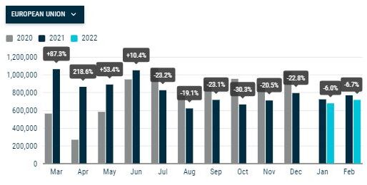 Im Februar 2022 gingen die Pkw-Neuzulassungen in der Europäischen Union weiter zurück (-6,7 %), da die Automobilhersteller weiterhin mit Unterbrechungen der Lieferkette konfrontiert sind. Mit 719.465 verkauften Einheiten in der EU war dies das volumenmäßig schwächste Ergebnis für den Monat Februar seit Beginn der Aufzeichnungen. Die vier Schlüsselmärkte in der Region verzeichneten gemischte Ergebnisse. Italien und Frankreich verzeichneten zweistellige Verluste (-22,6 % bzw. -13,0 %), während Spanien und Deutschland zulegten (+6,6 % bzw. +3,2 %).