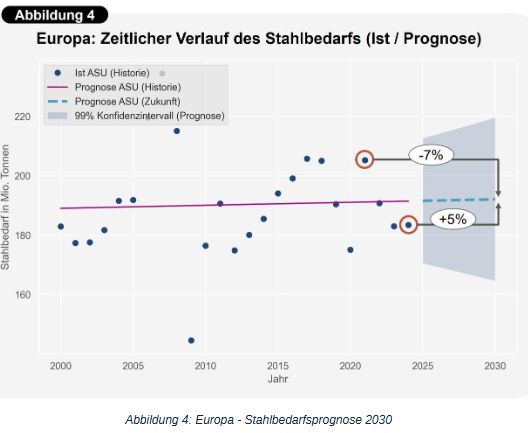 - Bis 2030 ist kein strukturelles Wachstum des Stahlbedarfs in Europa zu erwarten; gegenüber dem schwachen Jahr 2024 wird jedoch eine moderate Erholung von rund 5 % prognostiziert.