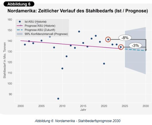 - Bis 2030 ist kein strukturelles Wachstum des Stahlbedarfs in Nordamerika zu erwarten; gegenüber dem Jahr 2024 wird sogar eine Reduzierung von rund 3 % prognostiziert.