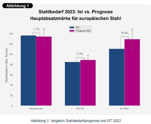 Im Zentrum unserer Prognose steht der „apparent steel use“ (ASU) für „finished products“, der als Maß für den tatsächlichen Stahlbedarf dient. Zur Validierung unseres Modells vergleichen wir unsere Vorjahresprognose mit den nun vorliegenden Ist-Werten für 2023 (Quelle: worldsteel). Abbildung 1 zeigt, dass unsere Prognose für Nordamerika mit einer Abweichung von nur 1,7 % sehr präzise war. Auch in Europa lagen die Ist-Werte für Ost- und Westeuropa mit Abweichungen von 4,4 % bzw. 14,4 % noch innerhalb des Konfidenzintervalls, jedoch weiter vom Erwartungswert entfernt.