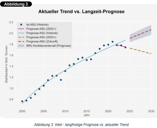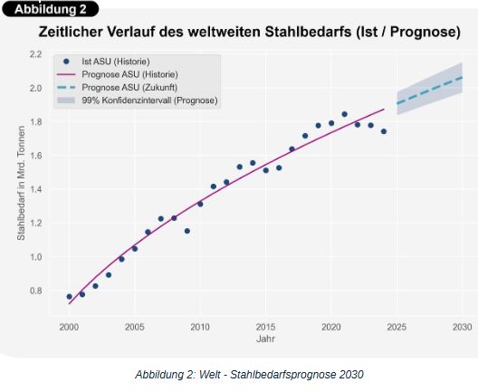 Das aktualisierte Prognosemodell zeigt in der langfristigen Betrachtung ein sich stetig verlangsamendes Wachstum des globalen Stahlverbrauchs (siehe Abbildung 2) und im Jahr 2030 einen Bedarf von 2,06 Mrd. Tonnen Stahl. Dabei spannt unsere Rechnung einen Erwartungskorridor von 1,97 bis 2,15 Mrd. Tonnen auf. Gegenüber 2024 entspricht dies einer Steigerung von ~18% und gegenüber dem historischen Höchststand von 2021 immer noch eine Steigerung um ~12%.