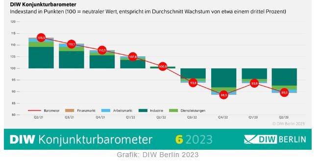 Das Konjunkturbarometer des Deutschen Instituts für Wirtschaftsforschung (DIW Berlin) liegt im Juni bei 89,5 Punkten und ist somit gegenüber Mai noch einmal leicht, um anderthalb Punkte, gefallen. Immer noch liegt der Wert deutlich unter der neutralen 100-Punkte-Marke, die ein durchschnittliches Wachstum angibt. Der jüngste Rückgang ist vor allem auf eine pessimistischere Stimmung in den Unternehmen zurückzuführen, deren Geschäftserwartungen sich laut Umfragen zuletzt merklich eingetrübt haben. Aus dieser Momentaufnahme muss aber nicht zwingend eine schlechtere wirtschaftliche Lage folgen. „Die weitere Entwicklung hängt insbesondere davon ab, ob die Weltwirtschaft wie vom DIW Berlin erwartet weiter moderat expandiert und die Inflation schrittweise zurückgeht. Eine geringere Teuerung würde vor allem die Kaufkraft der Haushalte und den privaten Konsum stützen,“ sagt Timm Bönke, Co-Leiter des Bereichs Prognose und Konjunkturpolitik im DIW Berlin. „Starke Zuwächse bei den Bruttolöhnen und -gehältern dürften im Zusammenspiel mit den steuerlichen Entlastungen, wie der Inflationsausgleichsprämie, die Kauflaune der Haushalte über den Sommer ankurbeln.“ ergänzt Geraldine Dany-Knedlik, Co-Leiterin des Bereichs.