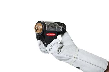 Der wahlweise gas- oder wassergekühlte Schweißbrenner Robacta Drive TPS/i kann mit extra kleiner Störkontur und reduziertem Gewicht nun auch bei Robotern mit nur 3 kg Traglast eingesetzt werden. Dank seiner kompakten Bauform und einer grundlegend weiterentwickelten Mechanik konnte die Bauteilzugänglichkeit und TCP-Präzision des Brenners nochmals erhöht sowie die Dynamik der Antriebseinheit gegenüber der Vorgängergeneration auf 33 m/s² verzehnfacht werden.