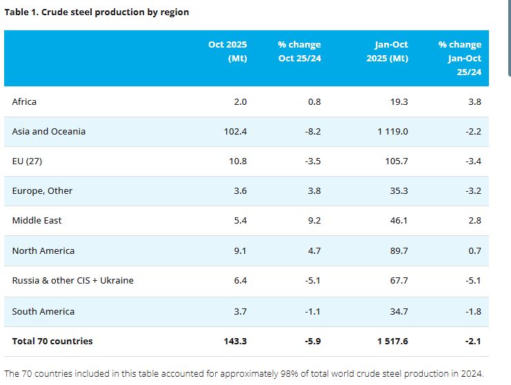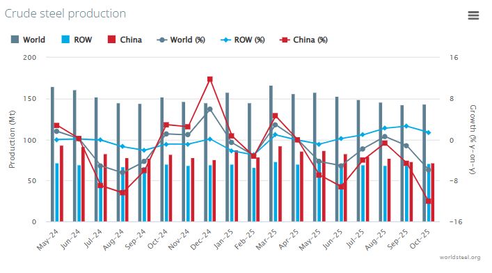 Weltrohstahlproduktion im Oktober 2025 rückläufig
