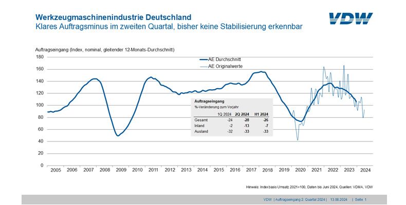 Im zweiten Quartal 2024 sank der Auftragseingang der deutschen Werkzeugmaschinenindustrie im Vergleich zum Vorjahreszeitraum um 28 Prozent. Dabei fielen die Bestellungen aus dem Inland um 13 Prozent, die Auslandsorders gingen um 33 Prozent zurück. Im ersten Halbjahr 2024 sank der Auftragseingang im Vergleich zum Vorjahreszeitraum um 26 Prozent. Das Inland verlor 7 Prozent. Das Ausland notierte 33 Prozent unter Vorjahr.