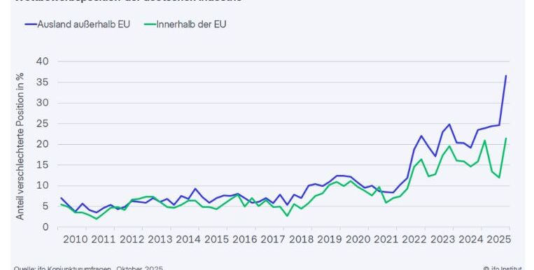 So viele waren es in den ifo Umfragen noch nie. Auch innerhalb Europas steigt der Druck: Der Anteil der Firmen mit sinkender Wettbewerbsfähigkeit gegenüber EU-Mitgliedstaaten stieg von 12,0 auf 21,5% – ebenfalls ein negativer Rekord. „Die Wettbewerbsfähigkeit der deutschen Industrie befindet sich auf einem neuen Tiefpunkt“, sagt Klaus Wohlrabe, Leiter der ifo Umfragen. „Das zeigt, wie stark die strukturellen Probleme inzwischen durchschlagen.“