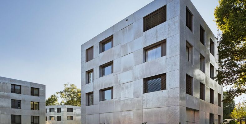 Wie schimmernde Kristalle, eingebettet in üppiges Grün, wirken die drei Wohnhäuser am Chilestieg im schweizerischen Rümlang. Die von Baumschlager Eberle geplanten Bauten orientieren sich aus städtebaulicher Sicht sensibel an ihrem Umfeld. Der sechseckige Zuschnitt und eine Fassade aus feuerverzinktem Stahlblech geben den Mehrfamilienhäusern einen markanten Auftritt.