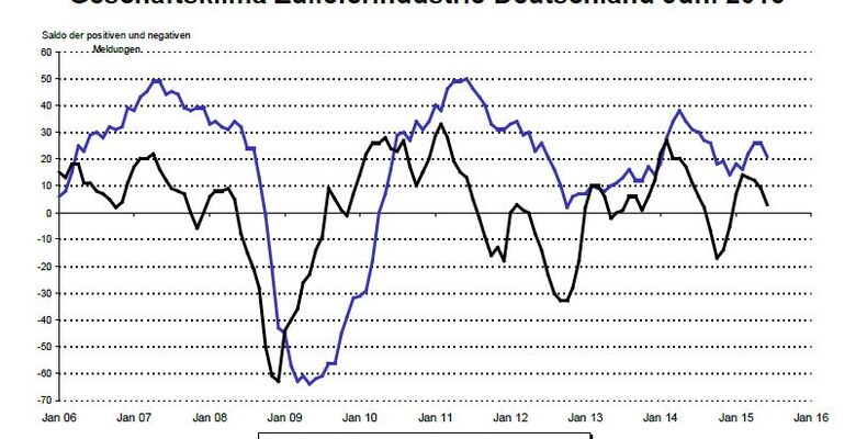 Die Perspektiven der deutschen Zulieferer für die zweite Jahreshälfte haben sich im Verlauf der letzten vier Monate spürbar abgekühlt. Die Bewertung der aktuellen Lage liegt noch deutlich im Plus, hat aber gleichwohl auch den Peak überschritten. Neben den schwachen Realdaten aus dem Bereich der Ausrüstungsinvestitionen drücken natürlich auch die laufende Diskussion über Lösungsansätze der Griechenland-Krise sowie aktuelle Entwicklungen in Krisenregionen wie der Ukrainer auf die Stimmung.