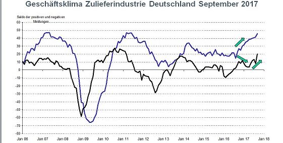 Sowohl die Einstufung der aktuellen Lage als auch die Hoffnungen bzgl. der mittelfristigen Entwicklung sind im September bei den deutschen Zulieferern auf Höchststände gesprungen. Seit Sommer 2011 wurde die Lage nie besser bewertet. Maßgeblich dazu trägt die Erholung im Maschinenbau bei. Seit dem Frühjahr hat sich die Nachfrage aus den wesentlichen Maschinenbausparten wie dem Werkzeugmaschinenbau, der Robotik, Automatisierungstechnik etc. spürbar verbessert. Zudem hält der Fahrzeugbau trotz der recht schwachen ersten Jahreshälfte noch ein hohes Niveau.