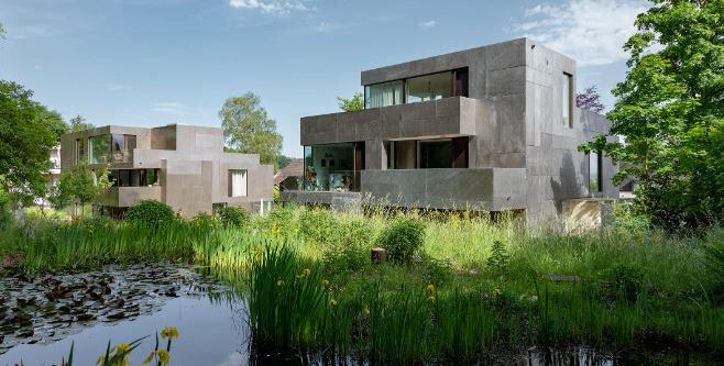 Kommentar der Jury: In einem stillgelegten Steinbruch in Feldbrunnen-St. Niklaus entstanden zwei Wohnkuben mit 5 Wohneinheiten. Die Gebäudehülle der Kuben wurde mit feuerverzinkten Stahlblechtafeln bekleidet, die Bezug zum Steinbruch nehmen. Durch unterschiedliche Plattengrößen und deren Anordnung wurden die durch den Felsabbau entstandenen Abbruchkantenmuster des Steinbruchs nachempfunden. Gleichzeitig erinnern die Plattenmuster an die Grundprinzipien der geometrischen Abstraktion von Künstlern wie Piet Mondrian oder Gerrit Rietveld. Durch die Auftragung einer speziell angefertigten Lasur auf Zinkfarbbasis durch einen regional bekannten Kunstschaffenden wurden die montierten, feuerverzinkten Fassadenplatten farblich an das im Steinbruch vorherrschende, leicht bräunliche Farbspektrum des Jurakalks angepasst. Die Jury war nachhaltig vom Fassadenkonzept der Kuben begeistert, das die Muster und Farben des Steinbruchs zitiert, aber diese gestalterisch mittels einer metallischen Fassade umsetzt.