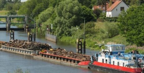 Bildtext: Stahlschrott gehört seit jeher zu den wichtigen Transportgütern in der Binnenschifffahrt – hier ein Schubverband auf der Hohensaaten-Friedrichsthaler Wasserstraße entlang der Oder.